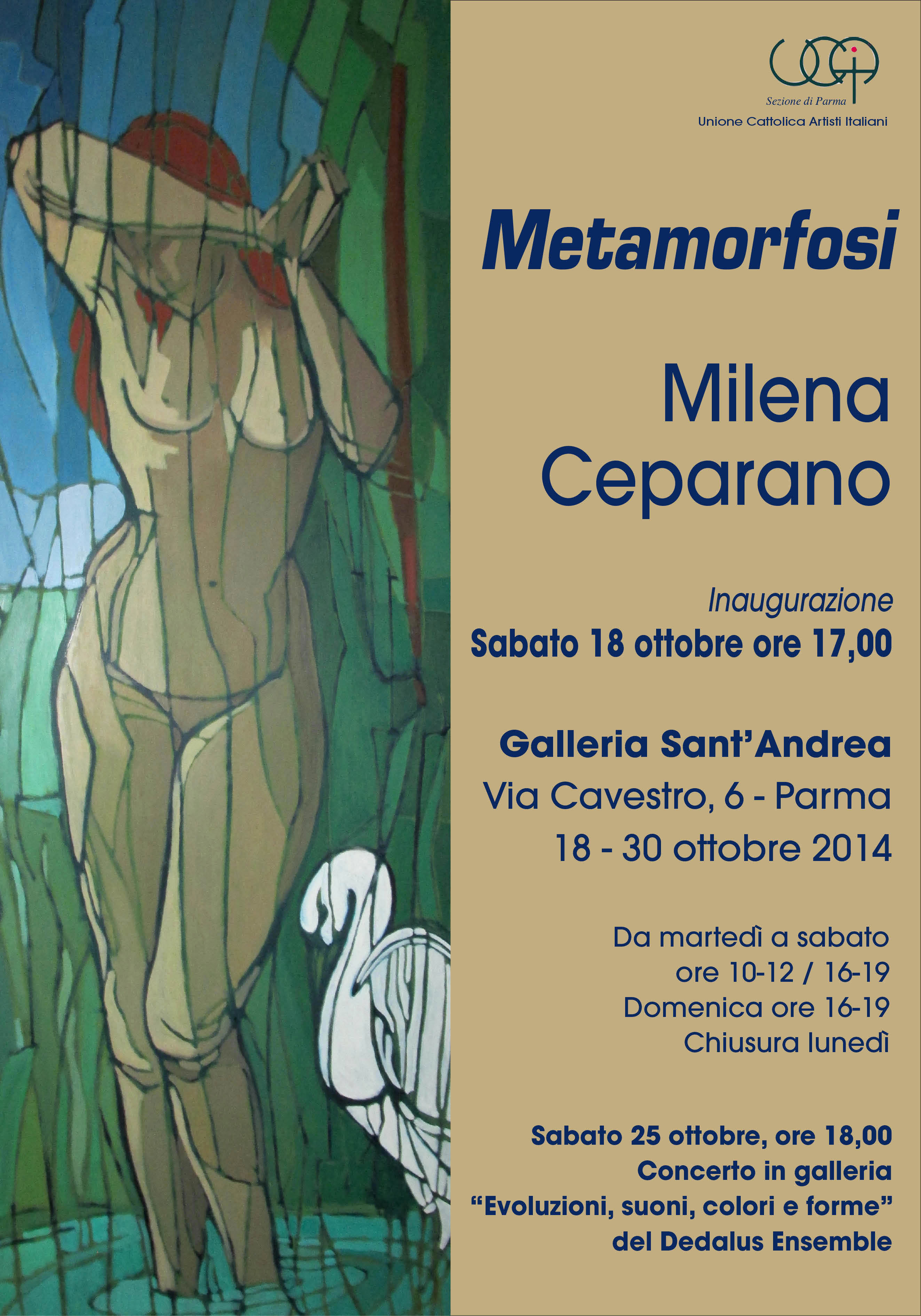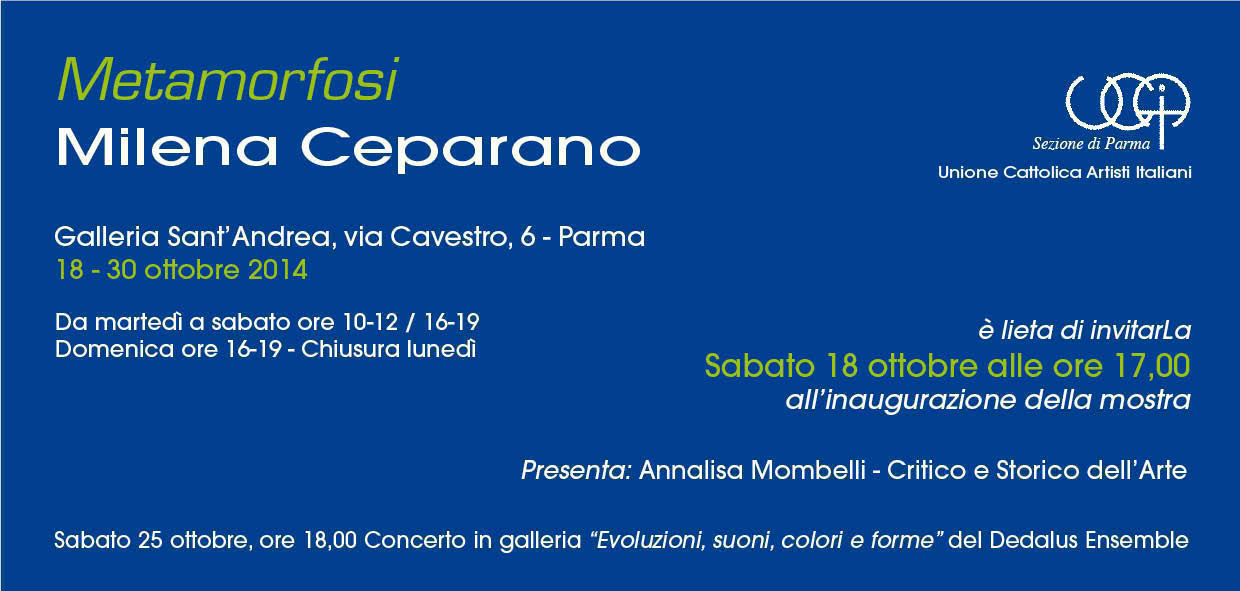 L' antologica organizzata presso la Galleria S. Andrea ripercorre gli ultimi 20 anni di produzione della Maestra d'Arte parmense Milena Ceparano. È una raccolta di dipinti da cui si evince il forte intreccio creato dall'artista tra la propria vita e l'arte e l'interesse per una continua e costante ricerca pittorica e tematica in cui lasciarsi suggestionare dagli “antichi maestri” ma tesa a creare un linguaggio unico e identificativo. La sua analisi pittorica parte dall'essere umano reso con grottesca e caricaturale ironia, scende in profondità nei misteri femminili e negli incubi-sogni dell'autrice, si rasserena nella celebrazione dei miti classici, per interrompersi bruscamente a causa di una tragedia familiare. Questa rottura affettiva segna un totale cambiamento nella sua arte. Il paesaggio diventa così protagonista nella seconda parte della mostra che è come un nuovo capitolo della sua vita. La Natura evanescente, raffigurata da alberi nodosi e corsi d'acqua dal lento fluire e resa con colori essenziali giocati tra sfumature di verdi, celesti e bianchi, è simbolicamente l' ambiente rifugio di Milena che sembra trovare in essa un equilibrio tra “essere” ed “esistere”.